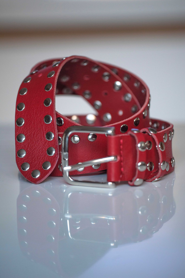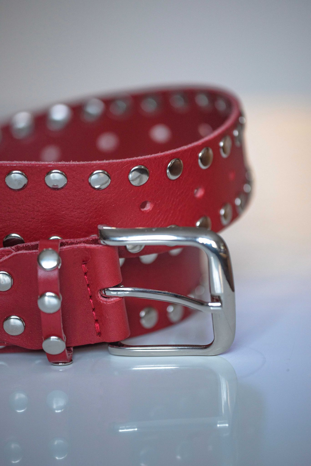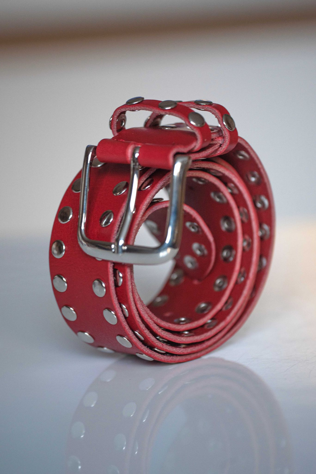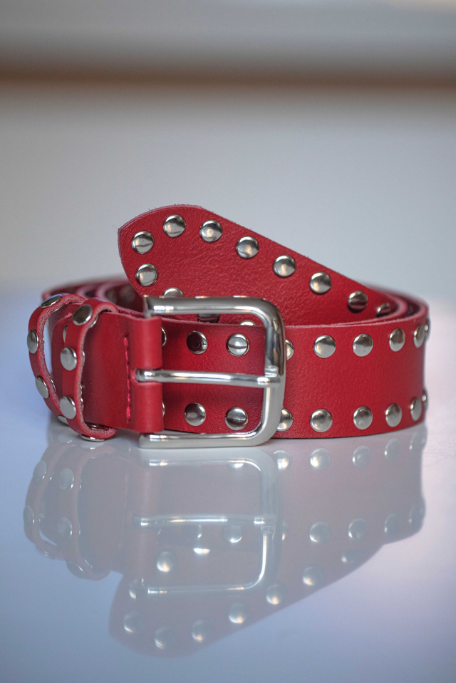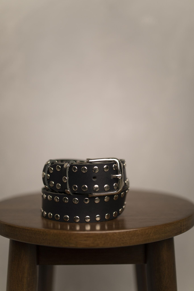 Rankų darbo 4cm diržas iš natūralios "pull-up" odos su kniedėmis, klasikine kvadratine sagtimi.