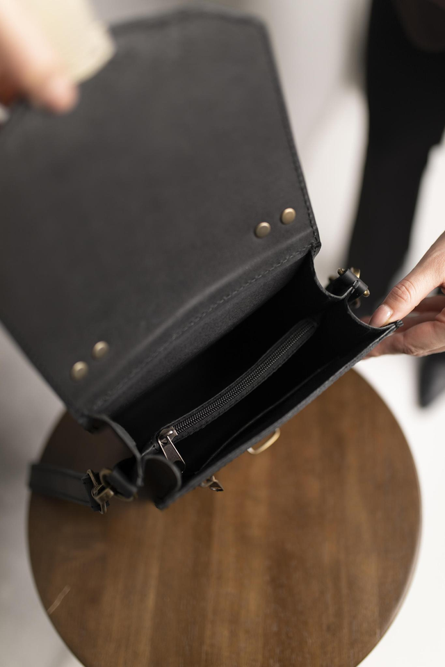 Priekyje – metaliniais užsegimais, kuris ne tik saugo turinį, bet ir suteikia solidų, vyrišką akcentą.